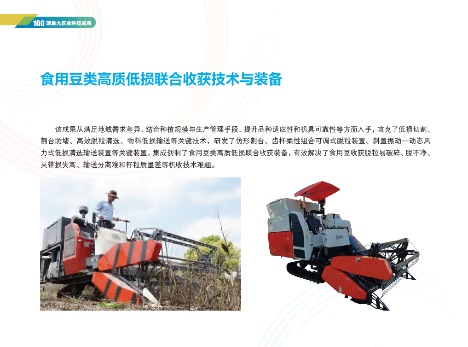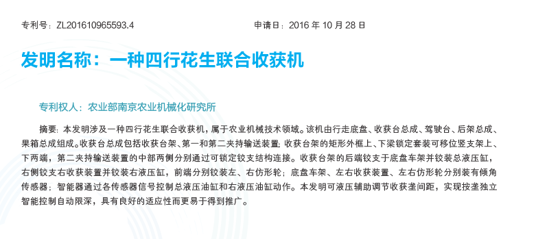 我所入选“100 项重大农业科技成果” 的“大豆高质低损智能化收获技术与装备”,通过农机、农艺、智能化技术融合,实现大豆机收减损提质,系列装备核心指标优于行业标准且推广超1500万亩;“食用豆类高质低损联合收获技术与装备”攻克食用豆机收破碎大、含杂高等关键难题,大幅提高籽粒收获品质,成果实现转化和产业应用。入选“50 件农业领域高价值发明专利”的“一种四行花生联合收获机”,创新两垄四行花生顺畅合并结构,提高联合收获作业效率。