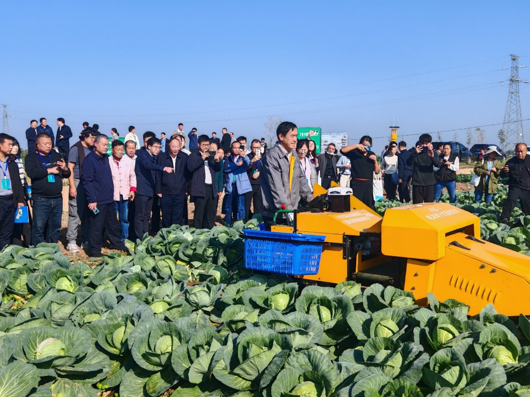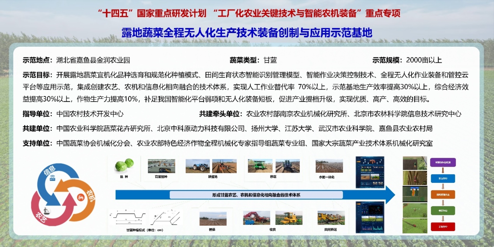 2024年我所牵头在嘉鱼县建立了露地甘蓝生产机械化无人化示范基地。一年多来,联合多家单位开展机械化生产模式推广、全程机械化装备应用、无人化作业技术示范,嘉鱼甘蓝生产机械化已取得了可喜的成绩。本次我所共有7款新装备参加现场作业演示,涵盖了甘蓝种植、收获、植保和尾菜处理环节,包括2款甘蓝移栽机、3 款甘蓝收获机、1款对靶变量施药机和1套智流膜堆肥装置。