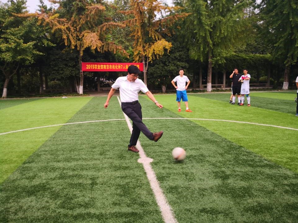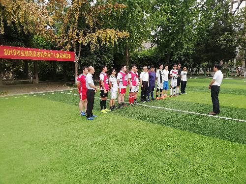 为了迎接新中国70华诞并积极响应推进所党委提出的“不忘初心、牢记使命” 主题教育活动,加强我所各部门之间的交流合作,丰富员工的户外娱乐生活,提高员工的综合素质,培养积极向上的进取精神, 提升员工们顽强奋斗、勇于拼搏的优良品质,所青工委团委联合所工会,于2019年9月26日拉开第五届农机所足球联赛的帷幕。联赛共有四支队伍参加,分别是足球一队:主要农作物生产装备工程技术中心、农副产品加工工程技术中心、植保与环境工程技术中心、农机化发展与信息研究中心、特色经济作物生产装备工程技术中心;足球二队:农业资源开发与设施农业工程技术中心;足球三队:检验与测试中心、农业部南京设计院;足球四队:综合管理处、科技管理处、成果转化处、计划与财务处、基建办公室、后勤服务中心。赛程为单循环积分制,排名按最终积分确定。开幕赛安排为一队对阵四队,所党委书记胡志超和所党办主任夏春华到场与队员们合影留念。胡志超书记还发表了讲话,他对所内七人制足球联赛这个传统体育赛事给予充分肯定,并勉励球员在赛场上积极拼搏,彰显青春气息,锻炼强健体魄,为农机事业打下良好基础,并为比赛开球。随着裁判员一声哨响,比赛正式开始,双方球队当天都有主力队员因故不能参赛,但都纷纷克服困难,整合出了各自的最强阵容出战。在比赛中大家也毫不拘谨,打出了各自的精彩水平。双方队员都竭尽全力,积极拼抢,展现着自己的才能,发挥着团队协作精神,在球场上你争我赶,不放过任何一个破门得分的机会,带球突破、犀利妙传、大力远射、精彩扑救不时上演,精彩场景层出不穷。最终,一队抓住机会利用对手门前混乱打入制胜一球,比分定格在0:1,一队全取三分,取得了绝佳的开局。