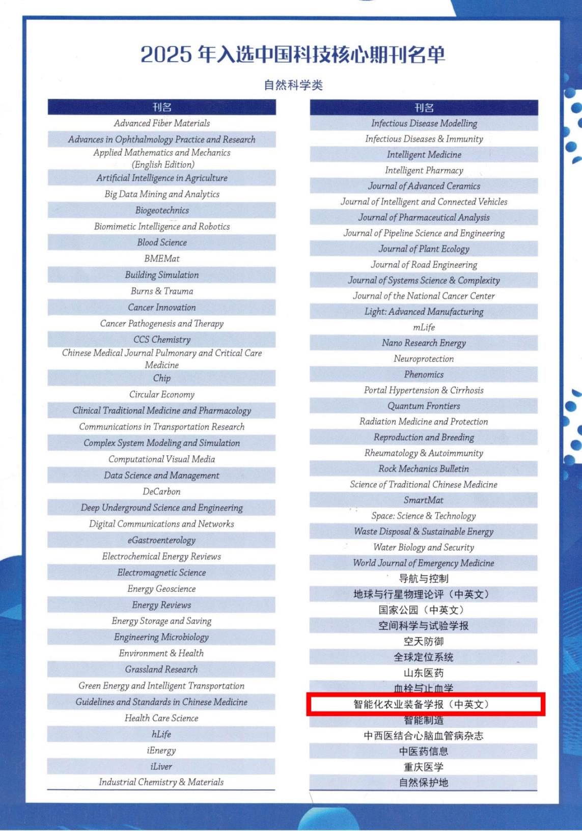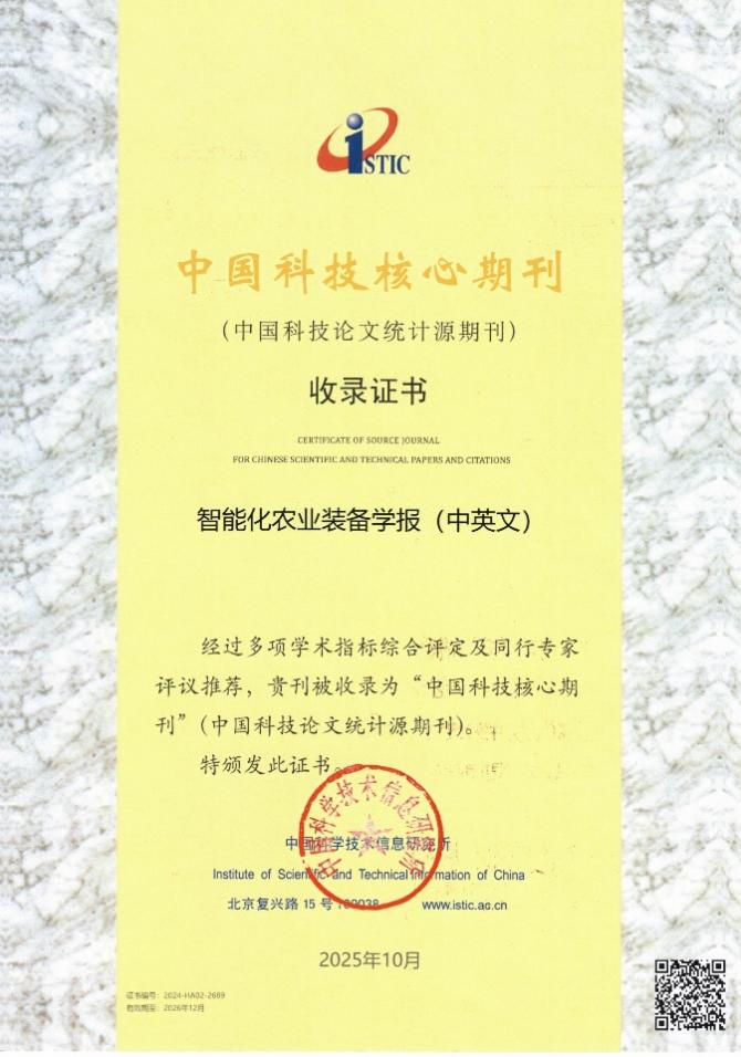 《智能化农业装备学报(中英文)》入选2025中国科技核心期刊目录
