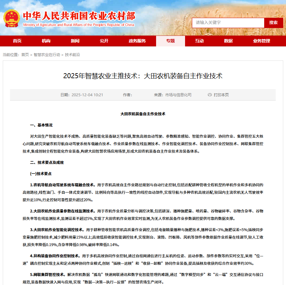 近日,农业农村部发布2025年智慧农业主推技术评选结果,我所主要作物智能农机装备与技术创新团队的科研成果“大田农机装备自主作业技术”成功获评,成为全国10项主推技术之一,成果已由农业农村部“智慧农业在行动”专题专栏展播。