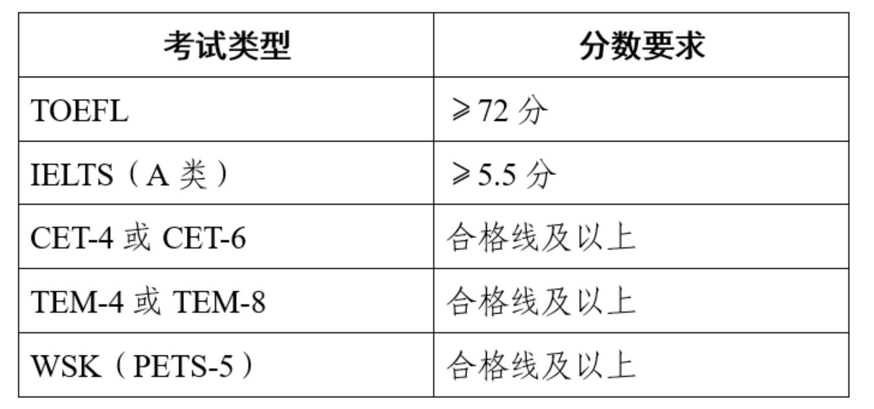 TOEFL、IELTS(A类)、全国大学英语考试(CET-4或CET-6)、国家英语专业考试(TEM-4或TEM-8)、全国外语水平考试(WSK,PETS-5)。