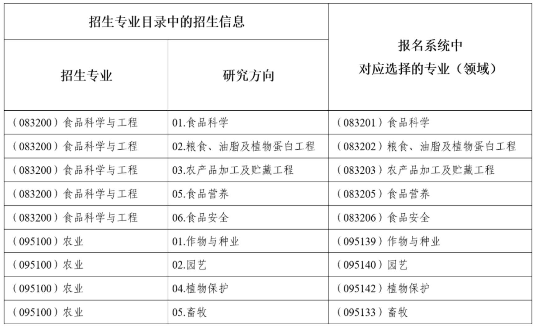 2.我院(0832)食品科学与工程博士学术学位授权点与(0951)农业博士专业学位授权点,2026年均按照一级学科/学位类别进行招生,一级学科/学位类别下设研究方向。在博士报名系统中,根据不同的研究方向,需选择对应的专业(领域)进行报名(见下表):